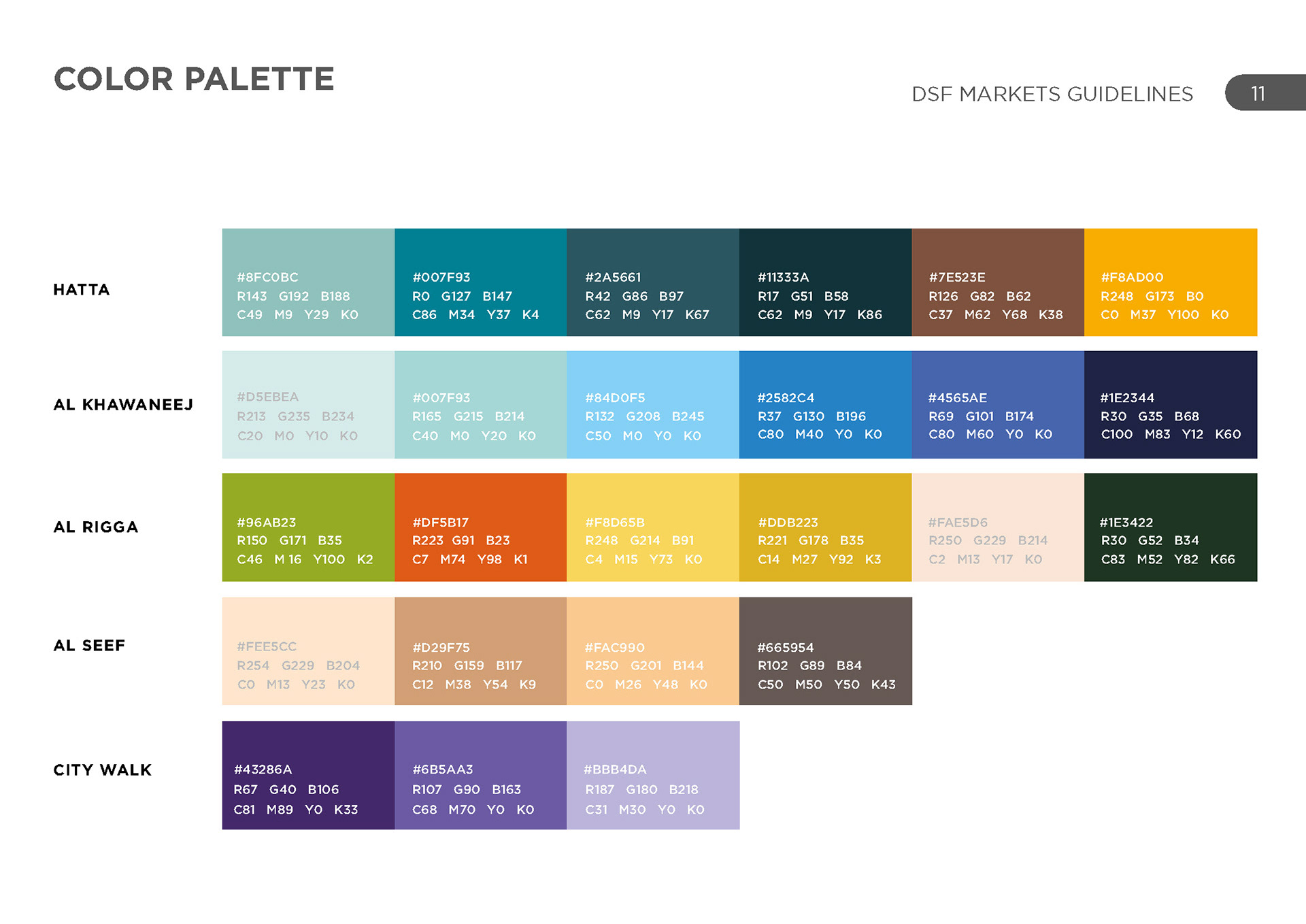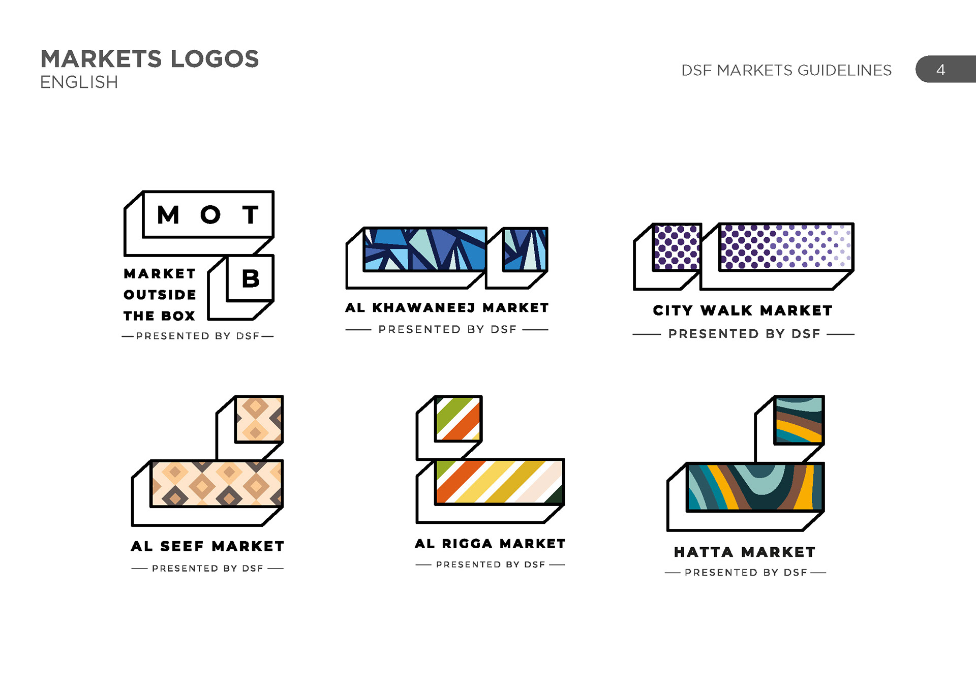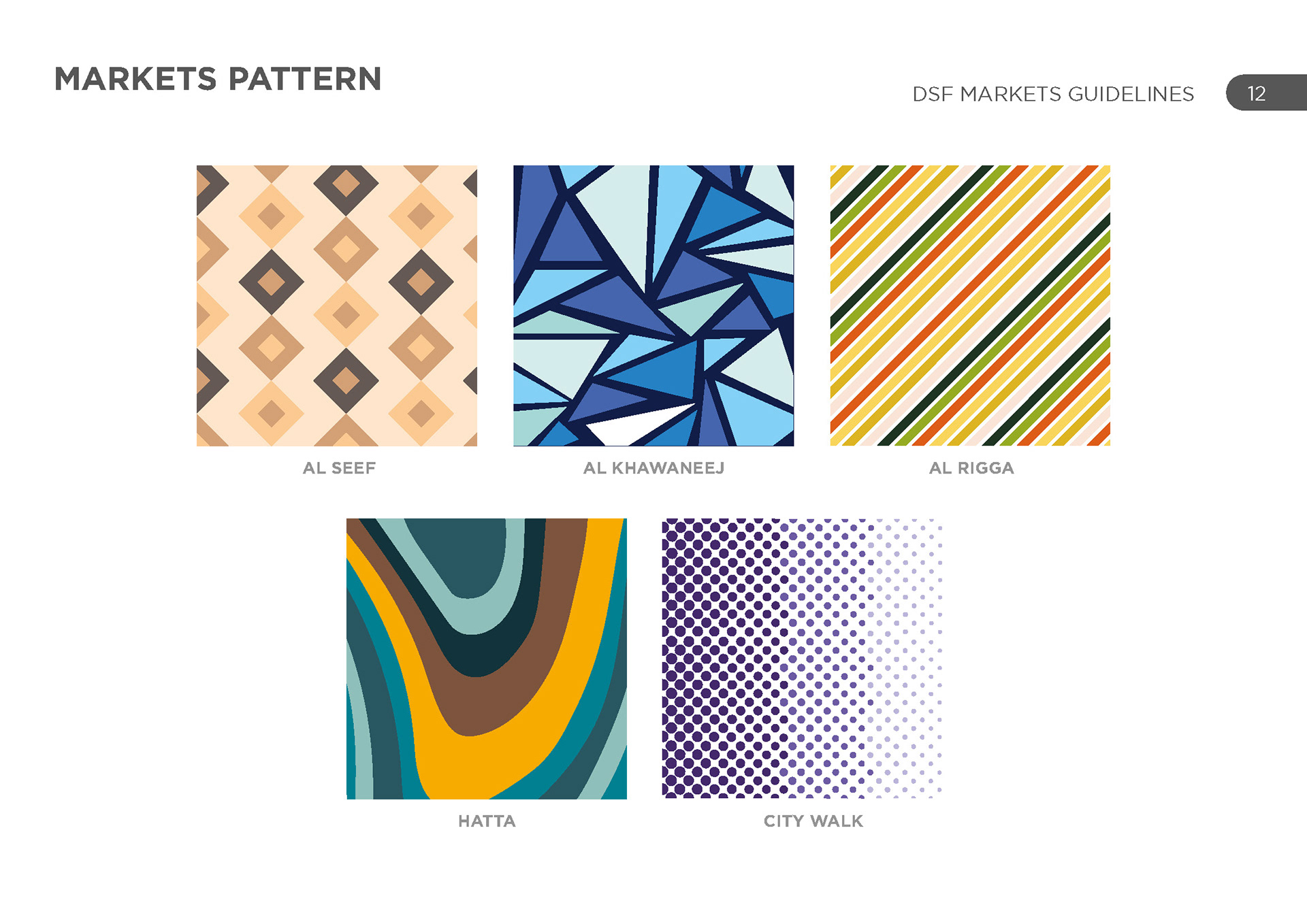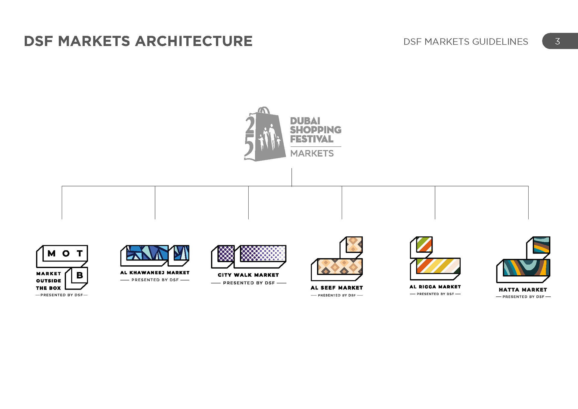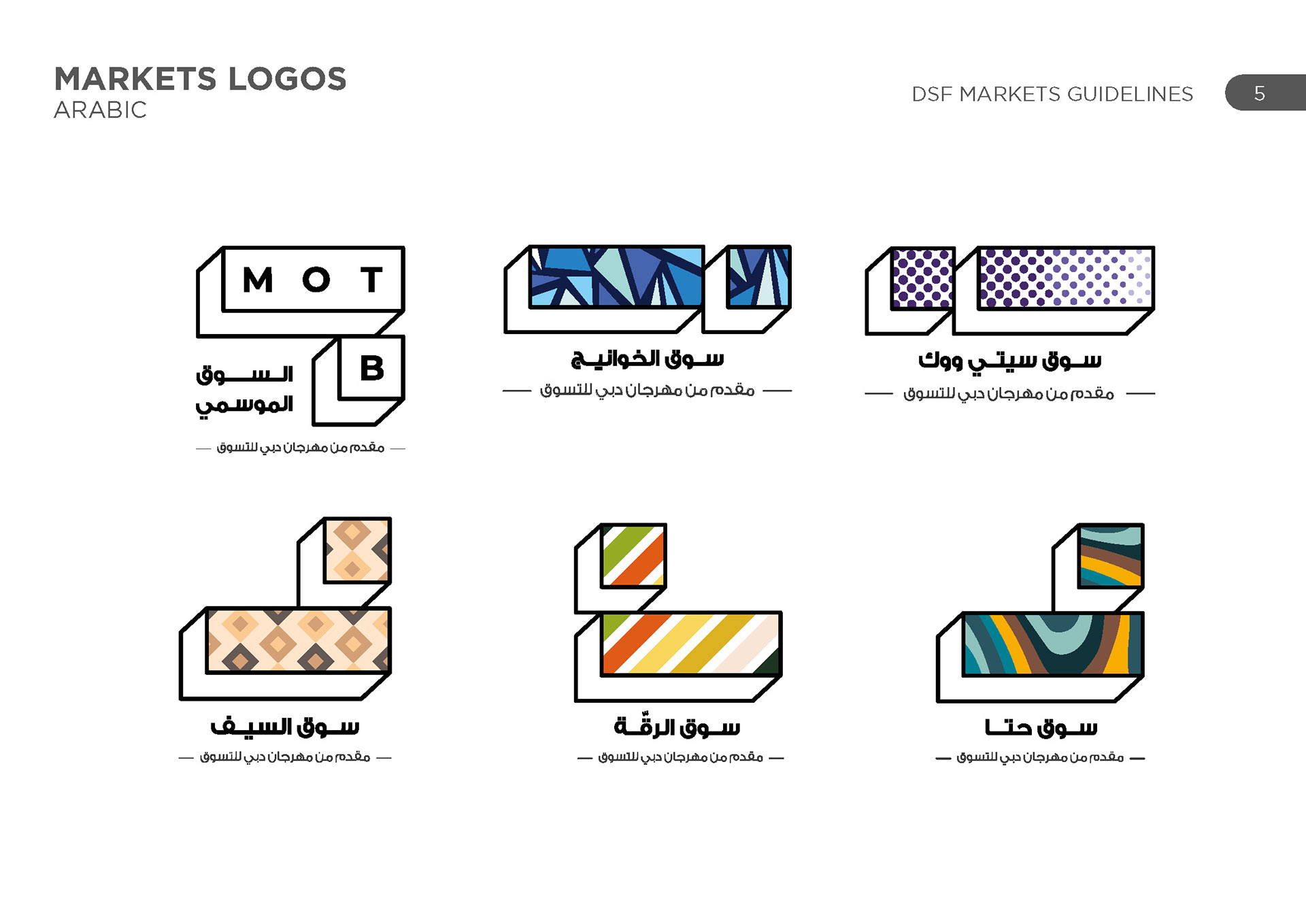 DSF markets was a group of various activities across the UAE in various locations, each with their own unique identity and geography. The challenge was to represent each one uniquely and create a cohesive set of schedules for each one.