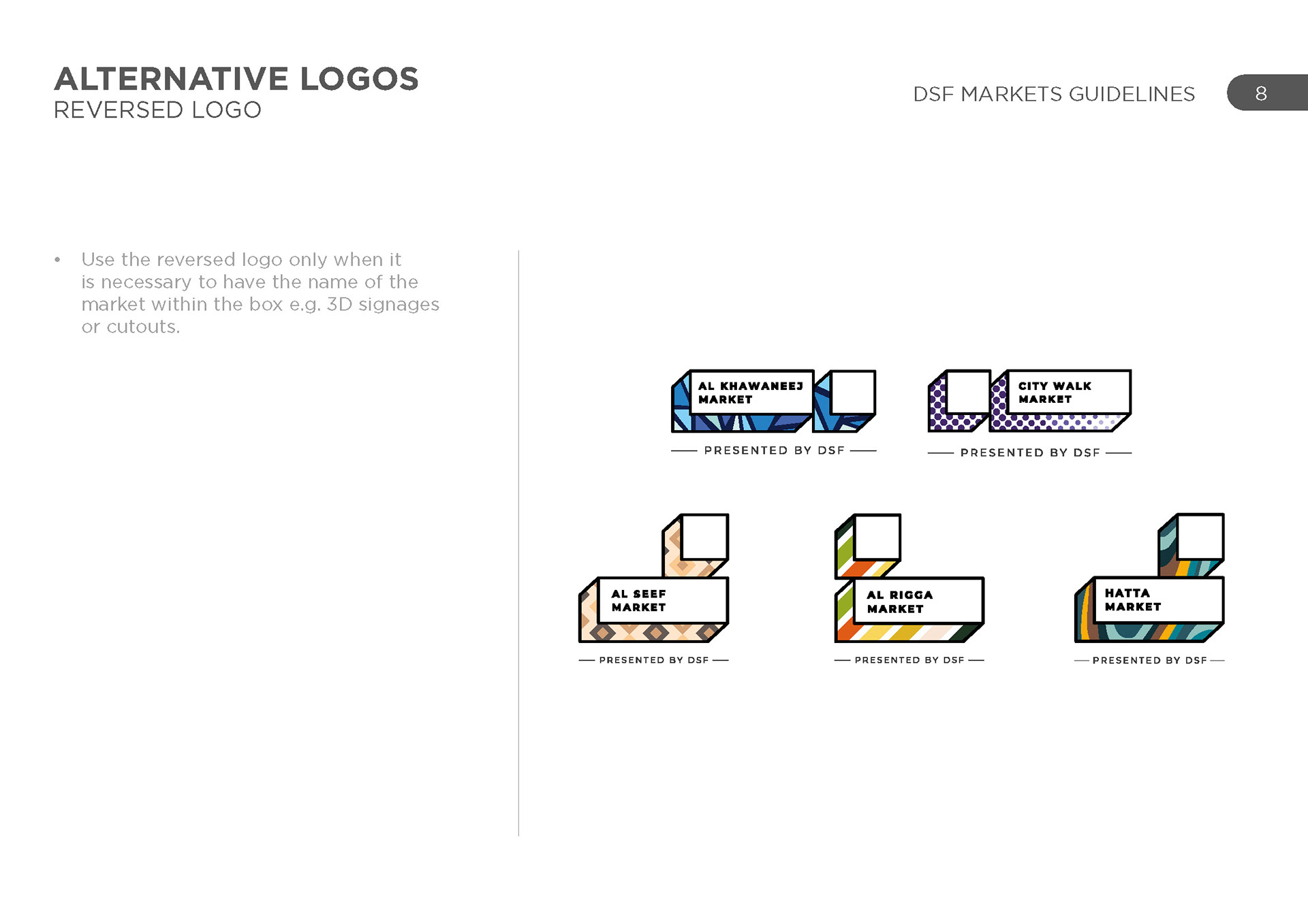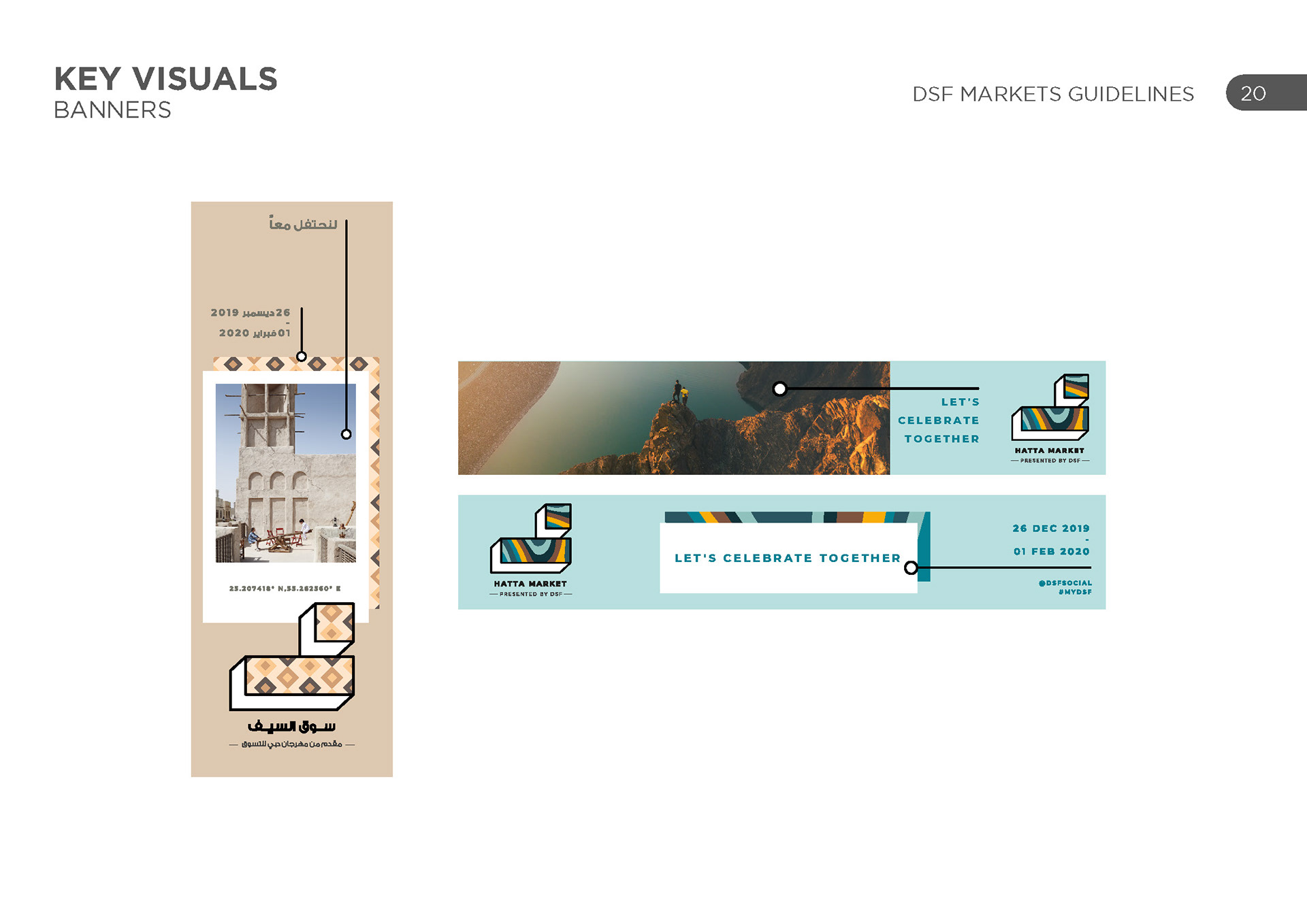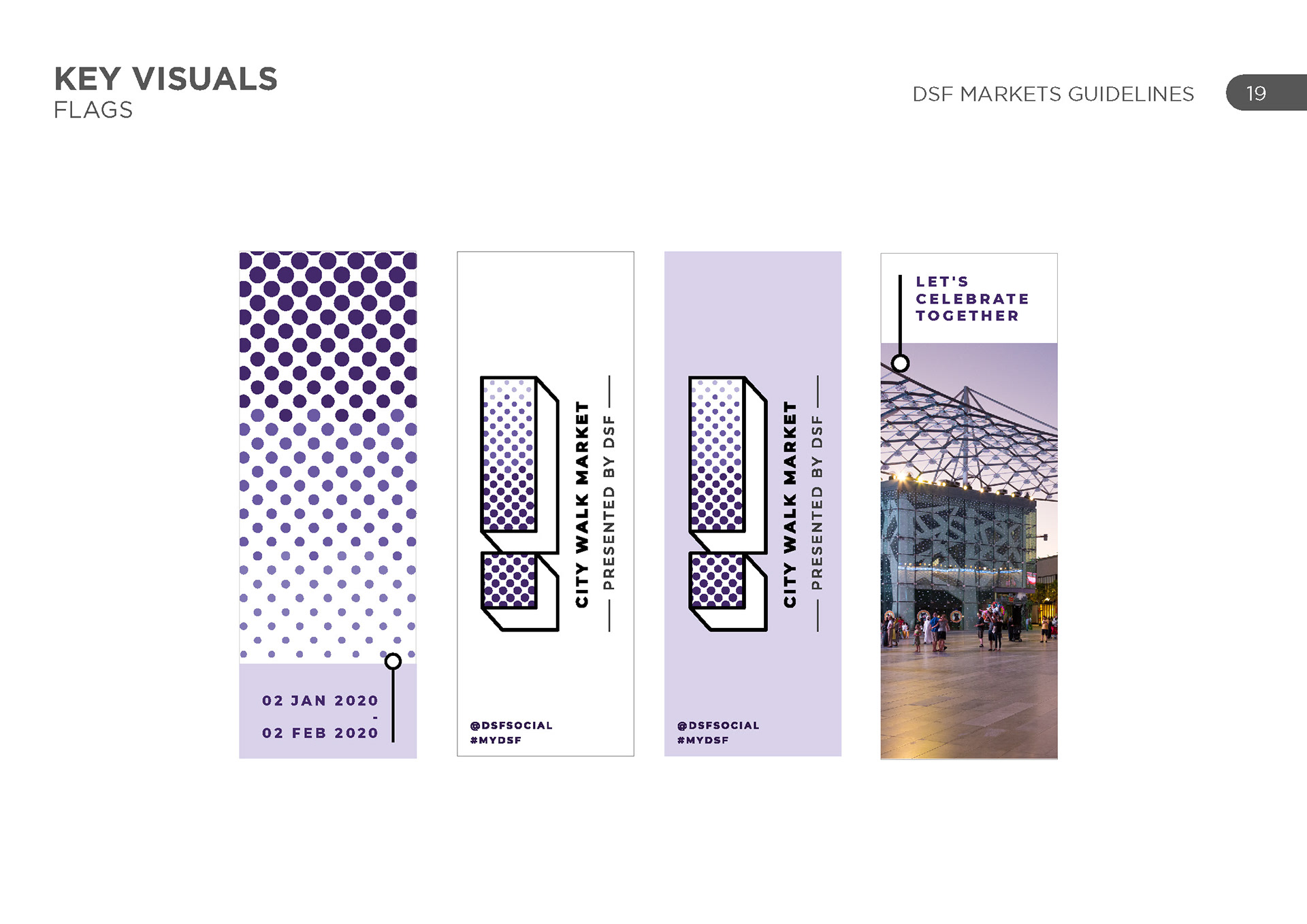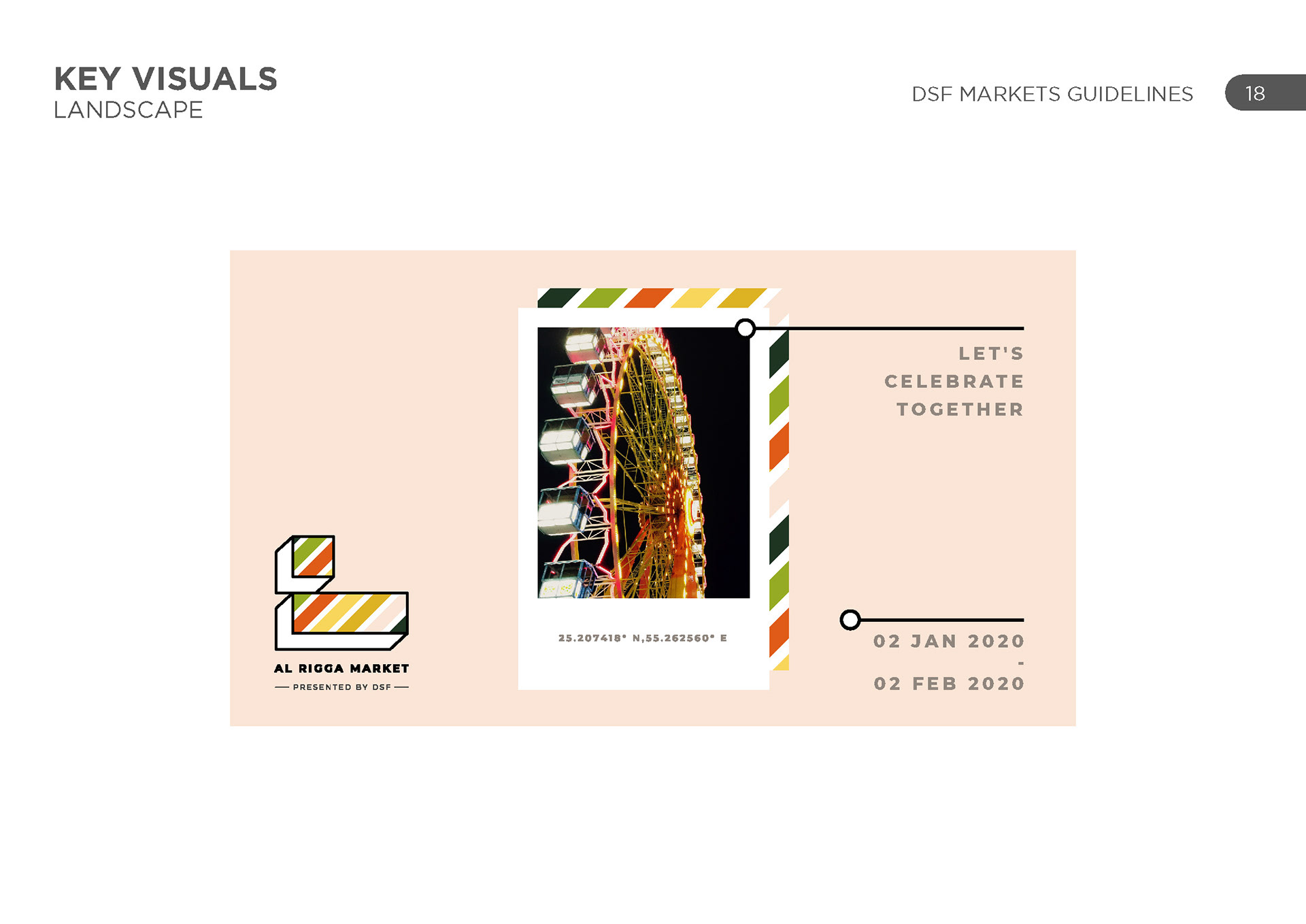 DSF markets was a group of various activities across the UAE in various locations, each with their own unique identity and geography. The challenge was to represent each one uniquely and create a cohesive set of schedules for each one.